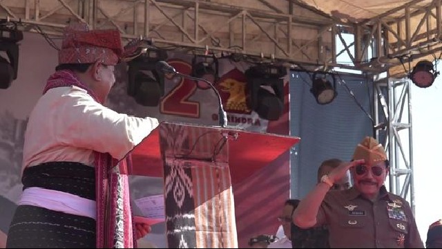 Kehadiran Prabowo di tengah-tengah puluhan ribu pendukungnya itu disambut secara meriah. Prabowo juga disematkan pakaian adat dari Raja Belu.