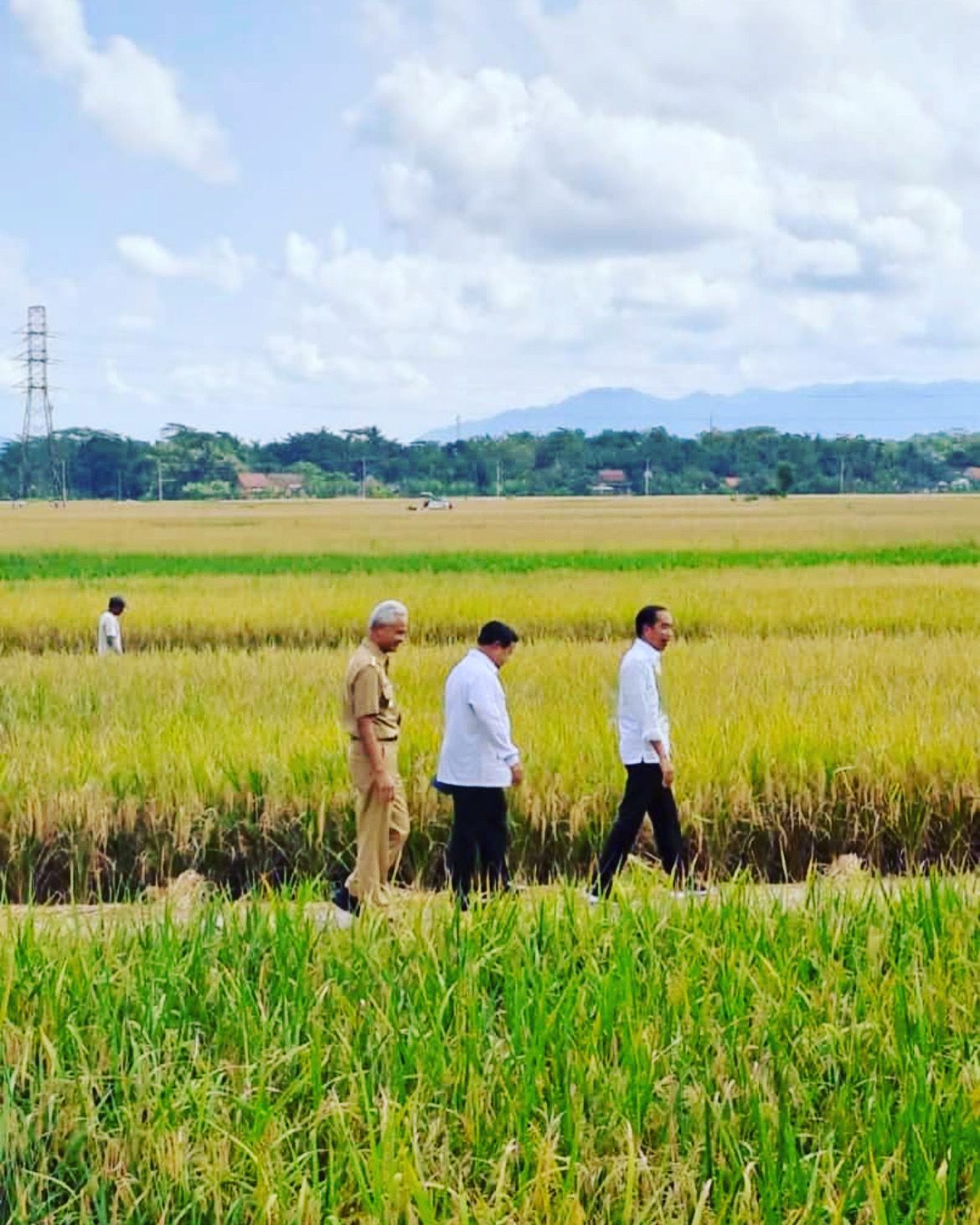 Di sela-sela kegiatan panen raya padi di Desa Lajer Kabupaten , Presiden Jokowi tampak mengobrol serius dengan Ganjar dan Prabowo. Ketiganya juga terlihat berpisah dari rombongan pejabat lainnya
