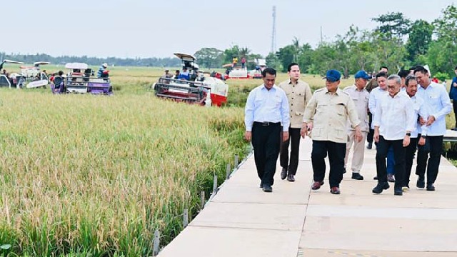 Setelah itu, Presiden Prabowo berjalan menuju hamparan sawah di dekat lokasi acara. Padi menguning siap dipanen terbentang luas. Di sekitar sawah terlihat beberapa drone pertanian yang digunakan untuk mendukung proses produksi.
